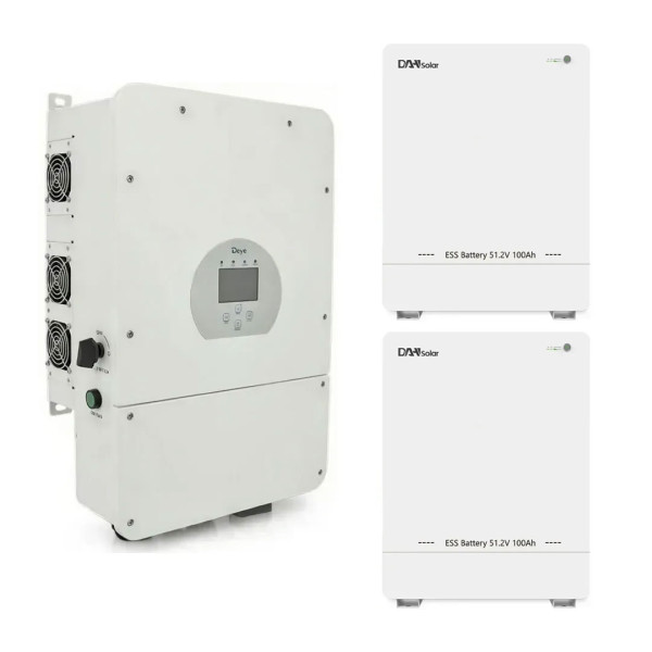 До складу входить гібридний інвертор Deye SUN-8K-SG05LP1-EU потужністю 8000 Вт та дві акумуляторні батареї DHN-LVWES05-G1 LiFePO4. Загальна енергоємність системи становить 10.24 кВт·год (корисна ≈ 9.2 кВт·год). Система працює з напругою 48 В і підтримує підключення до електромережі, генератора та сонячних панелей.
